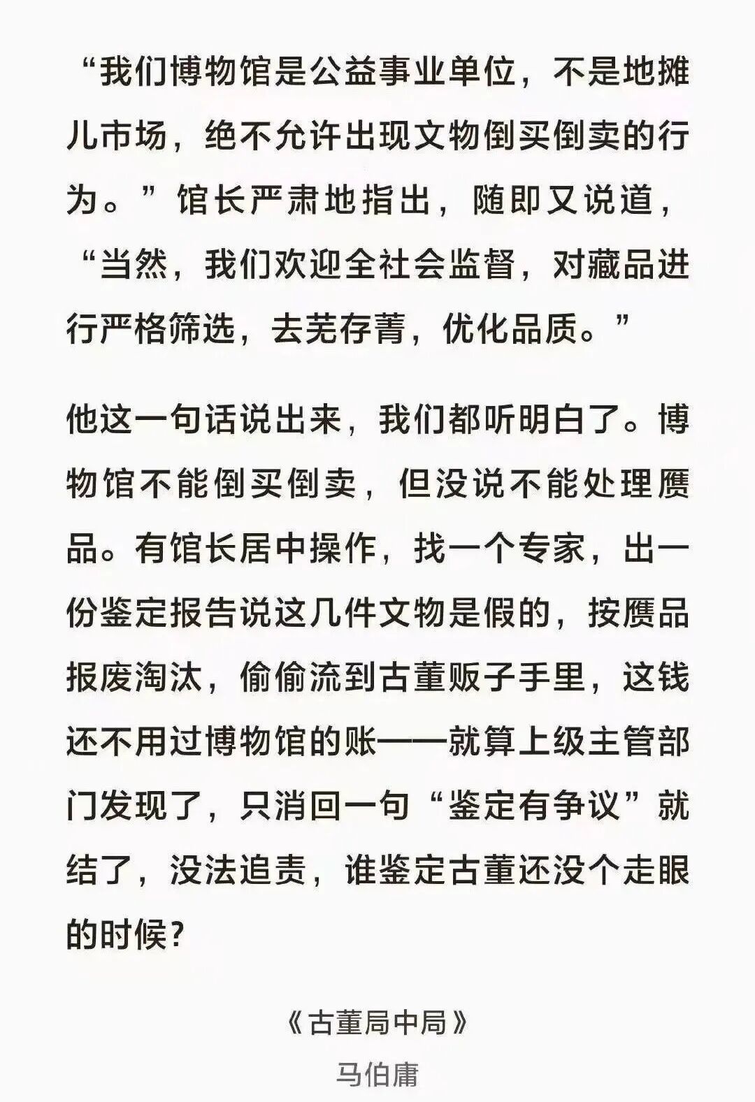 在小说《古董局中局》里,写过这么一段:找个专家出份假鉴定,把真品说成赝品报废,悄悄流到古董贩子手里。上级发现了,一句“鉴定有争议”就能搪塞,“谁鉴定古董还没个走眼的时候?”